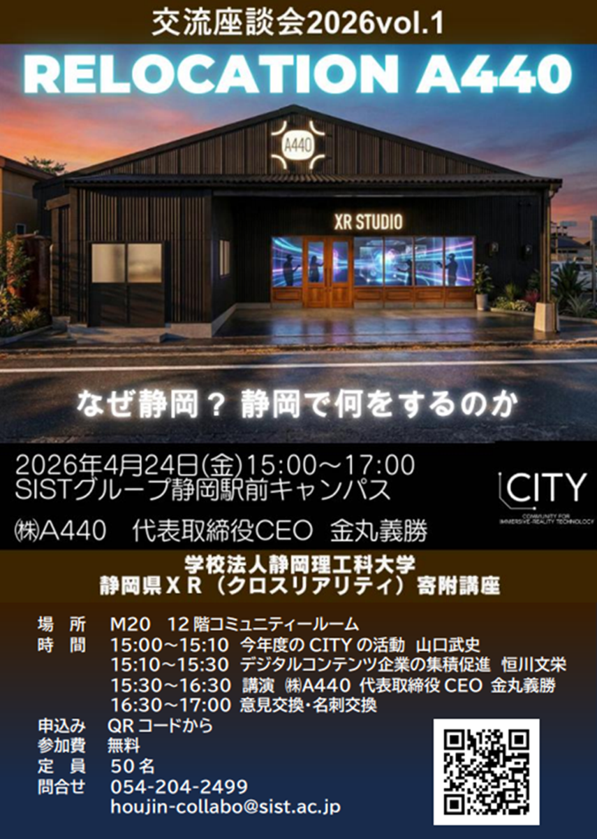 4月に本社を東京から静岡へ移転する株式会社A440をお迎えします。 最先端のテクノロジーとエンターテインメントを融合し、ARアプリ開発やVR空間・システム開発など、XRコンテンツを手がける株式会社A440の代表取締役CEO・金丸義勝氏にご登壇いただきます。 15:00~15:10 今年度のCITY座談会の年間活動予定 【山口武史】 |