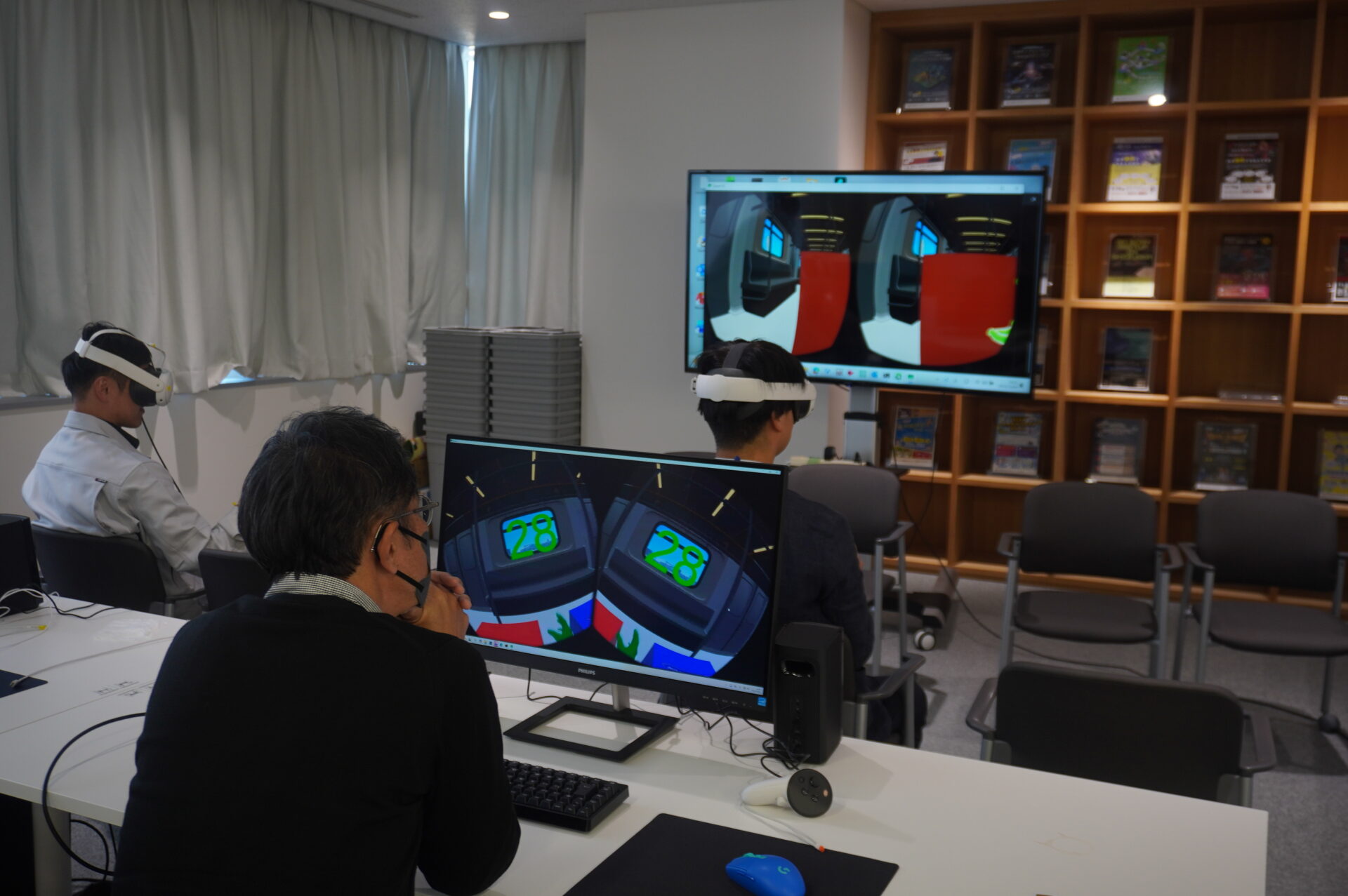 参加者の皆様は、学生の考えた「間違い探し」と「速さと感じる時間との相関関係」の体験をしました。「間違い探し」では、VRでの情報をいかにお互いにうまく伝えられるかが重要で、コミュニケーション能力が鍛えられ、企業では課題解決へのチームビルディングに貢献できる体験となりました。また、体験する人だけではなく、観衆も二人の動きや解決の過程や展開を可視化できるため退屈することなく参加者全体で盛り上がりました。