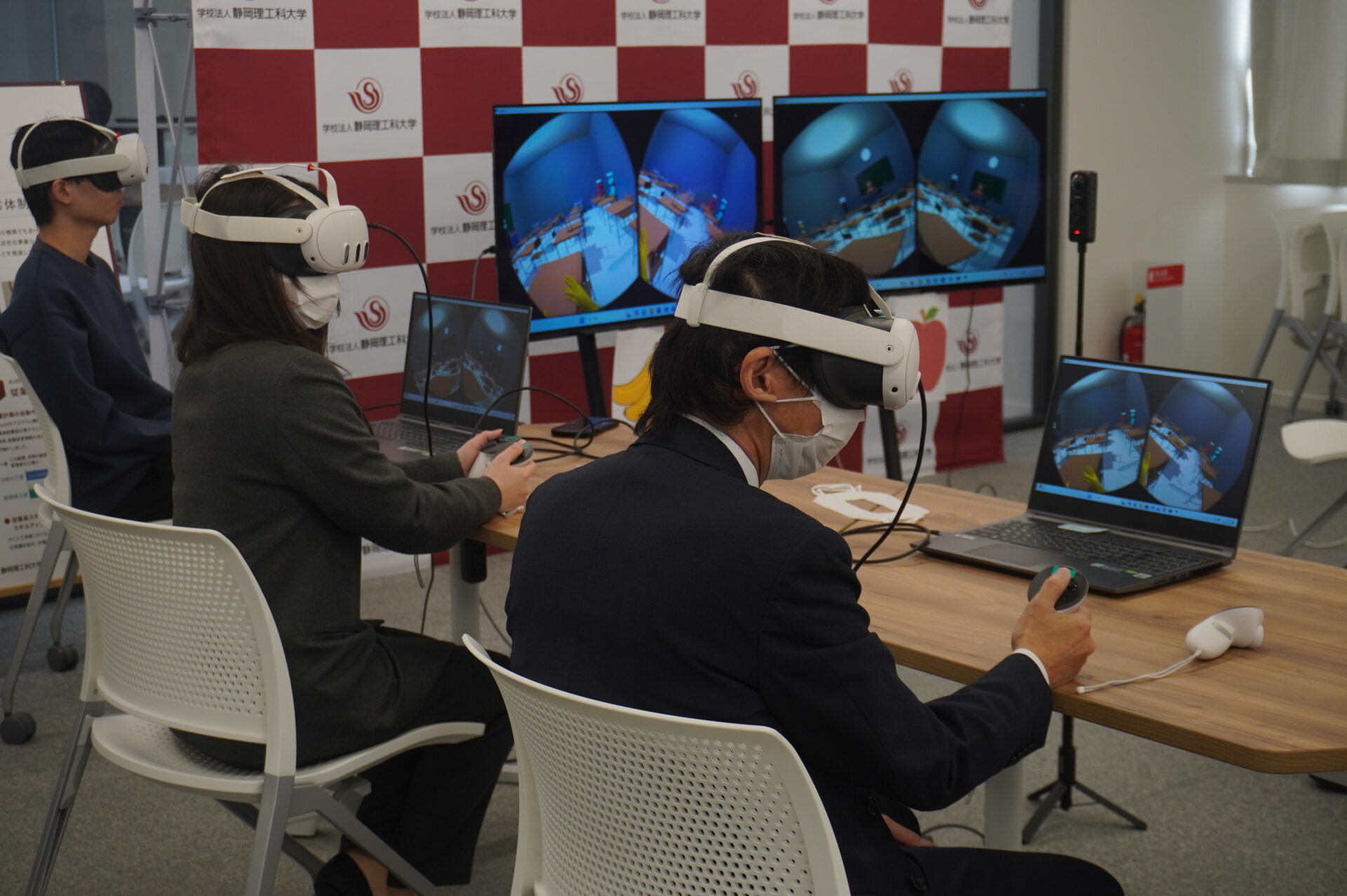 今回は、アルファコード社提供のインターネット不要のメタバース「VRider COMMS」を活用した新たなコンテンツの紹介と、静岡理工科大学情報学部芦澤研究室の学生が制作した2つのプロダクトをCITYの会員の皆様と理工科大学法人本部の職員に体験してもらいました。