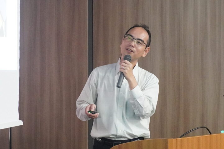 飛田教授の講演では、ロボット技術の歴史からAIによる「民主化」の可能性まで幅広く紹介。物体検出AIや折り紙を折るロボットの実演映像を通して、AIによる精密な動作や学習手法について解説しました。また、研究室で進められている車いす自動走行ロボットなど、人の役に立つ開発事例も取り上げられ、参加者に最先端技術への理解を深めていただきました。