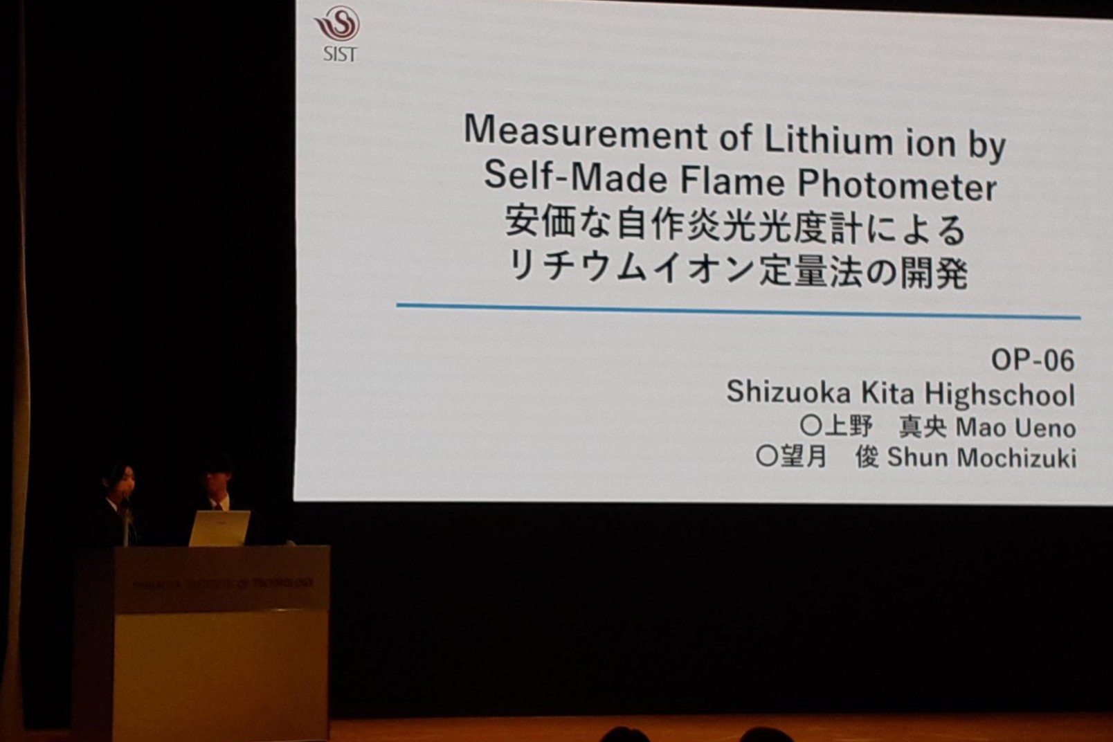 | 口頭発表 | 「安価な自作炎光光度計によるリチウムイオンの定量法の開発」 | 化学未来賞(全国2位) 水のオルガノ賞(企業賞) |